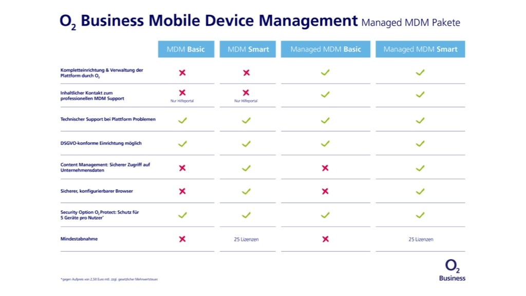 Unter dem Dach von O2 Business Managed MDM vereinen sich insgesamt vier Tarife, die auf die jeweiligen Bedürfnisse der Kunden abgestimmt sind. MDM Basic und MDM Smart gehören dabei zur klassischen Variante des O2 Business MDM. Darüber hinaus bietet O2 Business das Managed MDM Basic und das Managed MDM Smart an. Beide Versionen bieten den Kunden einen umfangreicheren Service sowie einen permanenten technischen Support (siehe Tabelle/Grafik).