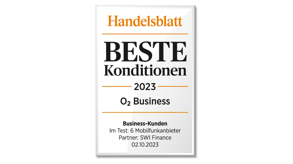Im aktuellen Test des Fachmagazins Handelsblatt kürten die Marktforscher von SWI Finance O2 Business zum Mobilfunkanbieter mit den besten Konditionen für Business-Kunden. Im Vergleich mit 5 anderen Mobilfunkanbietern sicherte sich O2 Business mit 89,0 von 100 Punkten nicht nur den Testsieg, sondern auch die Note „sehr gut“.*
